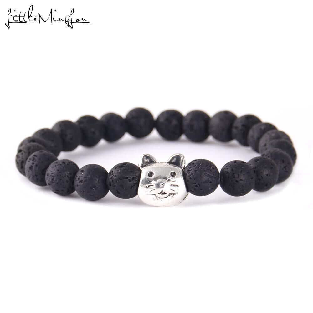 Stretchy bracelet made with black lava beads and a silver alloy cat bead, Fits a 7 1/4″ wrist comfortably.